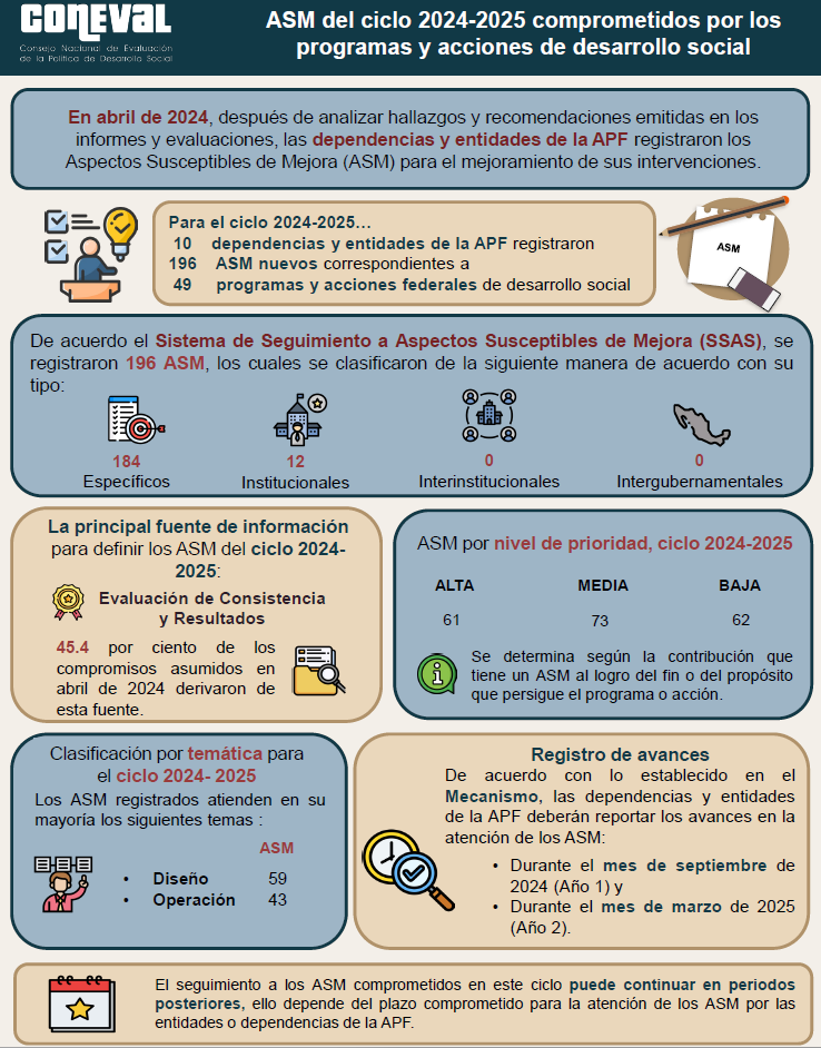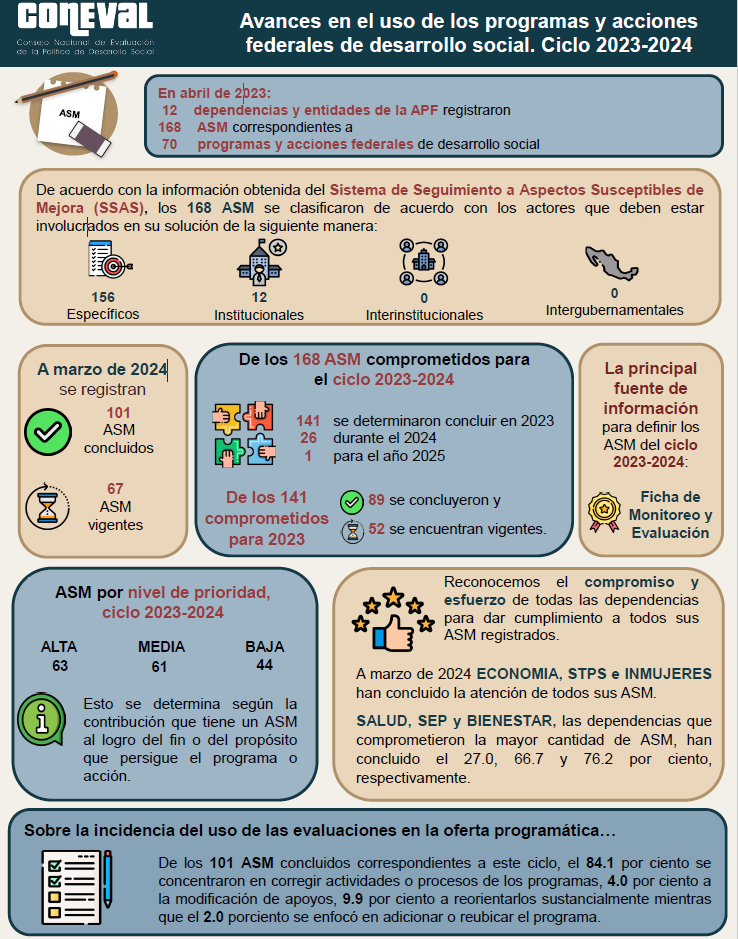 En este sentido, se presenta el Informe de Seguimiento a los Aspectos Susceptibles de Mejora de los Programas y Acciones Federales de Desarrollo Social 2023- 2024, que da cumplimiento al numeral 15 del Mecanismo para el Seguimiento a los Aspectos Susceptibles de Mejora derivados de Informes y Evaluaciones a los Programas Presupuestarios de la Administración Pública Federal (Mecanismo). Asimismo, proporciona un panorama sobre el uso de las evaluaciones en la toma de decisiones, a través de la transformación de los hallazgos, debilidades, oportunidades y amenazas, identificados en los informes de evaluación y otros informes, en compromisos de mejora.
