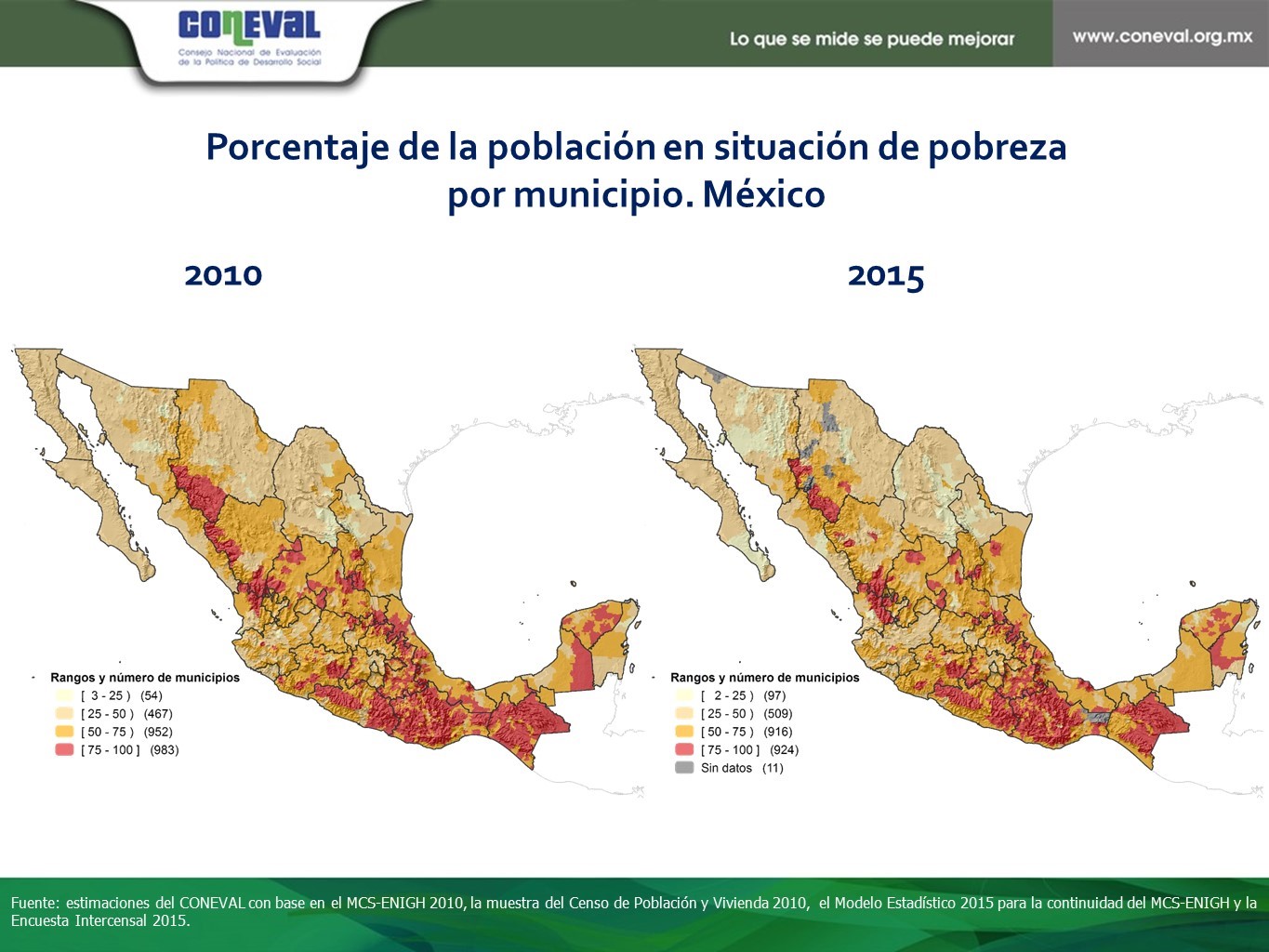 El Consejo Nacional de Evaluación de la Política de Desarrollo Social (CONEVAL) da a conocer a la ciudadanía la medición de pobreza a nivel municipal en 2015 y su comparativo con el año 2010. Con esta información se tienen, por primera vez, dos estimaciones en el tiempo de los indicadores de la medición multidimensional de la pobreza para los municipios del país, cuya comparabilidad registra la evolución de la pobreza a escala municipal.