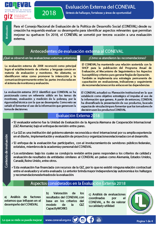 En 2018, la Agencia Alemana de Cooperación Internacional (GIZ) realizó una evaluación externa al CONEVAL que consistió en analizar tres aspectos principales: